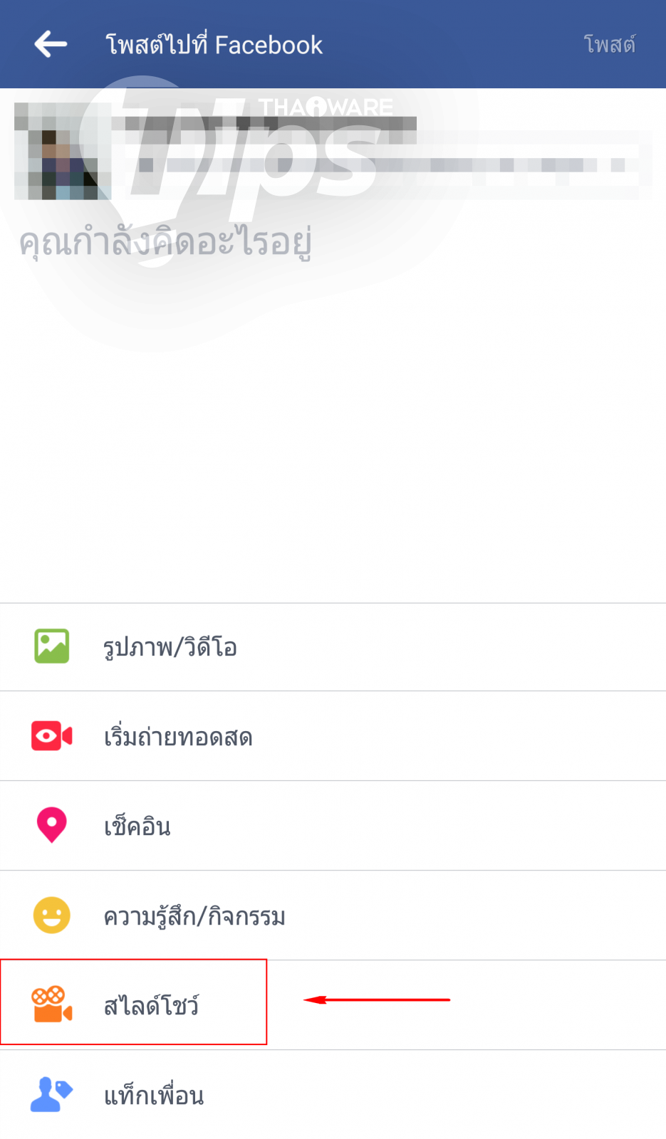 1. คลิกไปที่ตั้งสเตตัสเหมือนอย่างเคย ภายใต้สเตตัสให้เลือกเมนู Slideshow