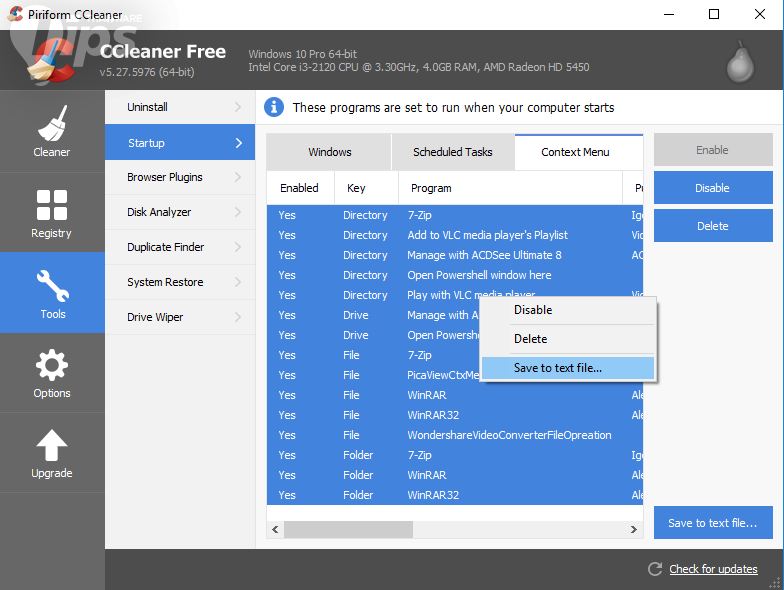 ดังนั้น เราควรทำการปิดโปรแกรม และลบเมนูคลิกขวาที่ไม่ค่อยได้ใช้งานออกไปบ้างครับ ซึ่งตัว CCleaner มีเครื่องมือสำหรับจัดการมาให้เราด้วย เรียกใช้โดยการไปที่เมนู Tools แล้ว Startup จัดการกับรายชื่อโปรแกรมได้ในแท็บ Windows ส่วนเมนูคลิกขวา สามารถเข้าไปลบได้ในแท็บ Context Menu