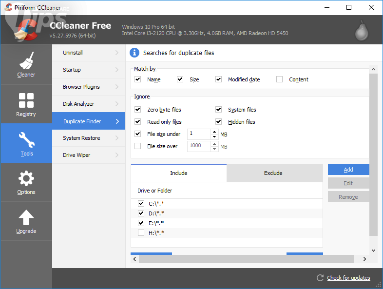 ไม่ใช่เรื่องง่ายเลย ในการจัดการกับไฟล์ที่มีซ้ำกันภายในเครื่อง ไม่ว่าจะเป็นรูป, เพลง หรือเอกสารที่ซ้ำๆ กัน ซึ่งใน CCleaner มีเครื่องมือสำหรับค้นหาไฟล์ที่ซ้ำกันใส่เข้ามาให้แล้ว โดยเลือกได้จากชื่อไฟล์, ขนาดไฟล์ และวันที่แก้ไขไฟล์ ตั้งค่าตามการต้องการแล้วคลิก Search ได้เลย