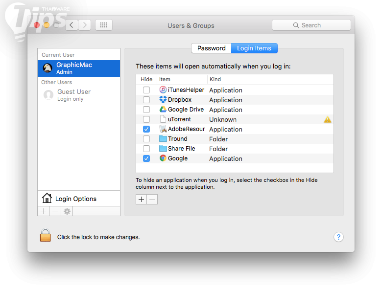 วิธีปิดโปรแกรมตอนเริ่มต้นเครื่องก็ไม่ยากครับ ไปที่ System Preferences >> Users & Groups ดูตรง Login Items. ติีกปิดโปรแกรมหรือแอปฯ ที่ไม่ต้องการให้ทำงานออก