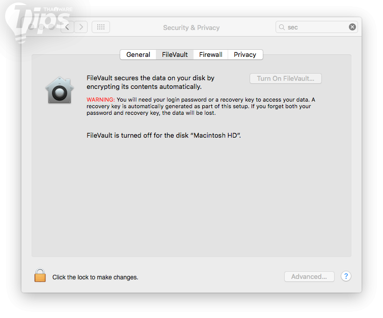หากเราต้องการปิดฟีเจอร์นี้เพื่อให้เครื่องเราทำงานได้เร็วขึ้นก็ทำได้ด้วยการไปที่ System Preferences >> Security & Privacy แล้วปิด FireVault