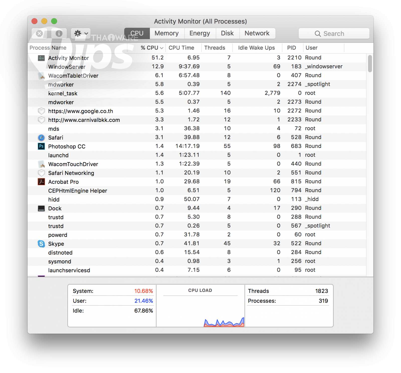 หากเราไม่ต้องการซื้อ CleanMyMac มาใช้ หรือต้องการปรับแต่งด้วยตนเอง เราสามารถใช้งานโปรแกรม Activity Monitor ในการหาต้นตอของปัญหาด้วยตนเองได้ ด้วยการเรียกใช้จากในโฟลเดอร์ Utilities โดย Activity Monitor จะแสดงให้เราเห็นว่าในขณะนี้มีแอปฯ หรือโปรแกรมไหนที่ทำงานอย฿่บ้าง พร้อมกับทรัพยากรที่โปรแกรมนั้นใช้งานอยู่ ซึ่งหากเราพบโปรแกรมที่ไม่จำเป็น ก็อาจจะตัดสินใจลบมัน เพื่อดึงทรัพยากรเครื่องกลับมาใช้งาน