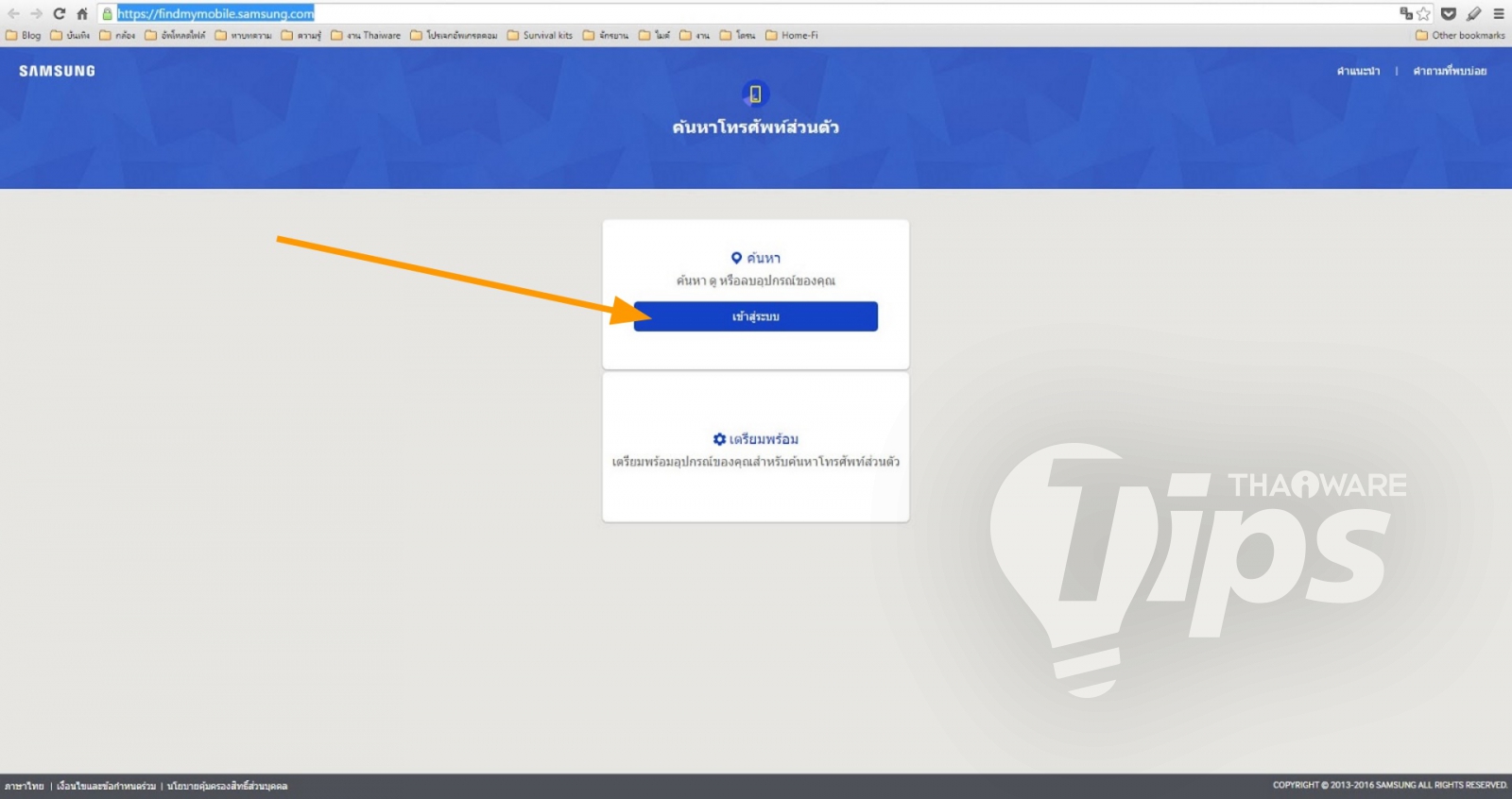 เปิดโปรแกรมเว็บเบราว์เซอร์บนเครื่องคอมฯ หรือโน้ตบุ๊ค แล้วไปที่เว็บ findmymobile.samsung.com แล้วคลิกที่ปุ่ม เข้าสู่ระบบ