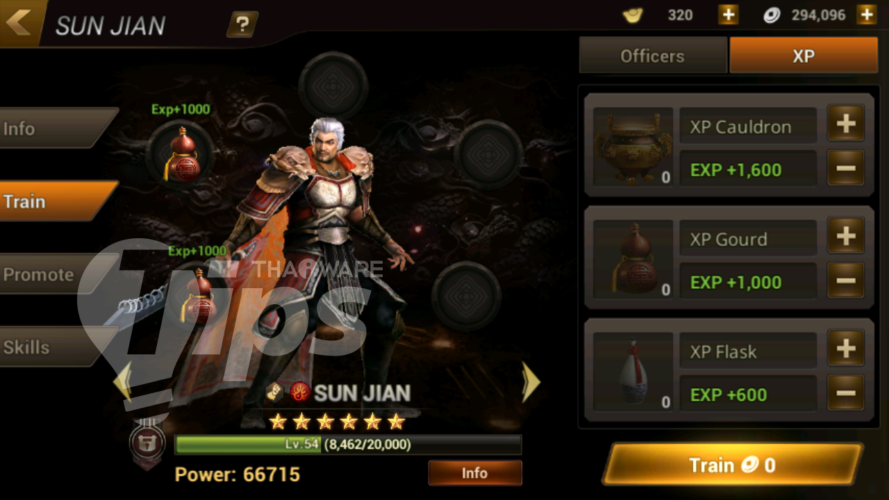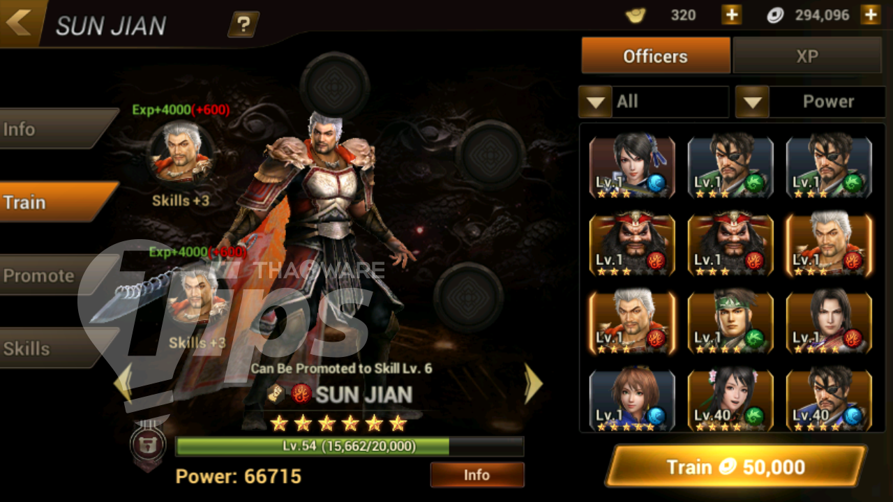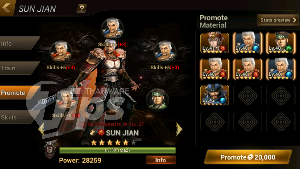 นอกจากการเพิ่มระดับสกิลขุนพลของเราด้วยการให้พวกเขารับประทานตัวเองแล้วนั้น ยังมีอีกหนึ่งวิธีที่ได้จะรับแต้มระดับสกิลเพิ่มมากกว่าปกติครับ นั่นก็คือการนำขุนพลตัวเดียวกันมาใช้ในการเพิ่มระดับดาว (Promote) โดยวิธีนี้ เราจะได้แต้มของระดับสกิลเพิ่มมาอีกประมาณหนึ่งเลยล่ะ แต่วิธีนี้มีข้อแม้ใหญ่ๆ อยู่ตรงที่ ขุนพลตัวเดียวกันที่เราจะนำมาใช้ในการเพิ่มระดับดาวนั้น ต้องมีระดับดาวตามที่พิธีการนี้กำหนด ฉะนั้นแล้วจงแข็งใจไว้ก่อน แล้วปั้มดาวขุนพลเหล่านั้นจนกว่าจะพร้อมแล้วค่อยมาใช้งาน (คิดซะว่าฝึกความอดทน ฮ่าๆ)
