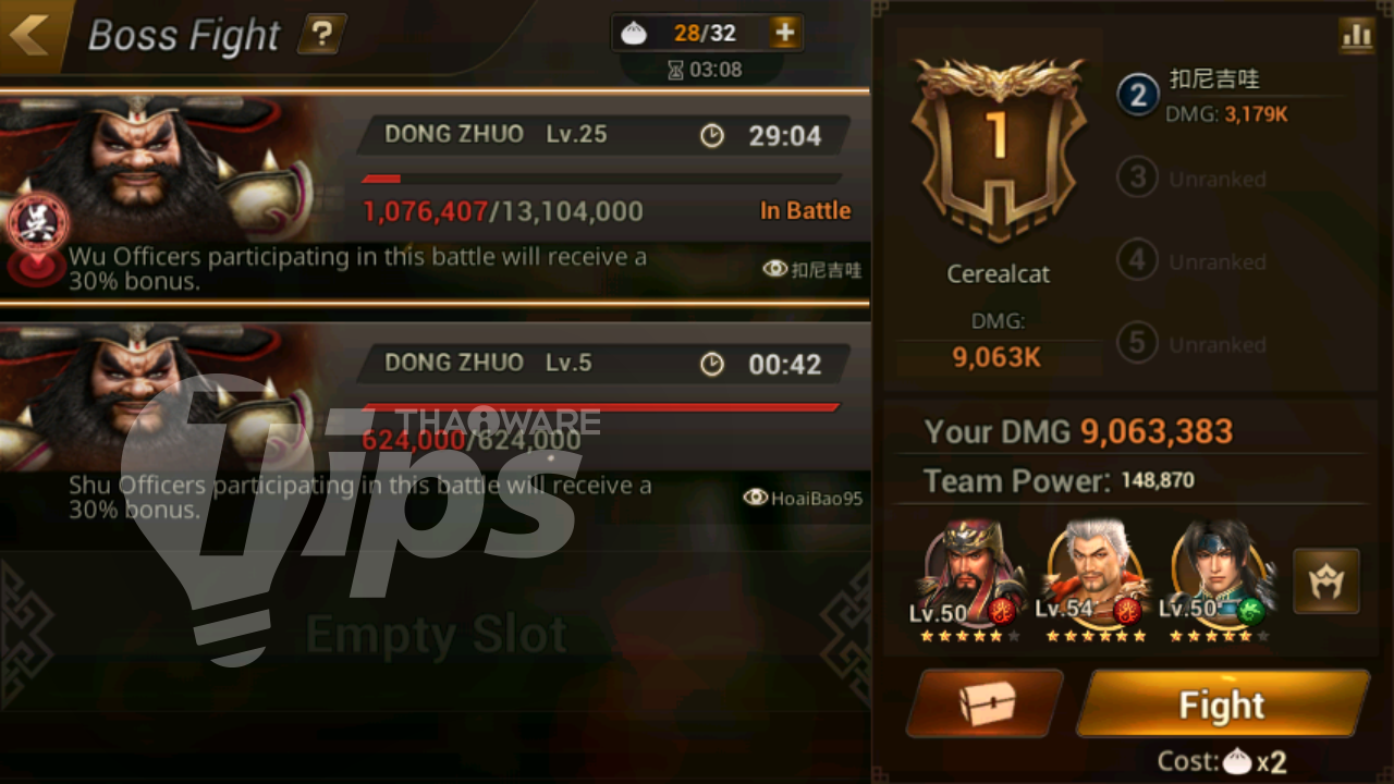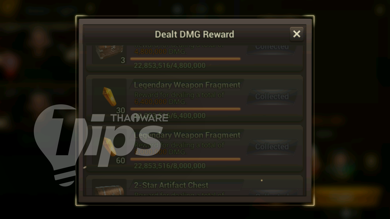 ภารกิจ Boss Fight ในโหมด Challenges นั้น ผู้เล่นจะต้องฟาดฟันกับตั๋งโต๊ะและสหายขุนพลอีกสองตนในระยะเวลา 1 นาทีต่อรอบ เพื่อสร้างความเสียหายให้ได้มากที่สุด และปลดล็อกรางวัลตามพลังโจมตีที่ทำได้ โดยสิ่งที่เราๆ ต้องการก็คือ Legendary Weapon Fragment ที่เมื่อสะสมครบ 200 ชิ้น ก็จะสามารถนำไปแลกเป็นอาวุธระดับตำนานที่จะเพิ่มสถานะแจ่มๆ ให้กับขุนพลของเราได้