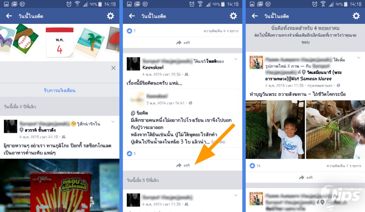 ก็จะเข้าสู่หน้าจอ วันนี้ในอดีต [ภาพซ้าย] ที่รวบรวมโพสต์ในอดีตของเรา และแน่นอนว่าทุกโพสต์จะมีปุ่มให้เราได้แชร์ความทรงจำในอดีตอีกครั้ง [ภาพกลาง] และมีการนำโพสต์ในช่วงวันที่ใกล้เคียงกันในอดีตมาแสดงด้วย [ภาพขวา] ไม่ต่างอะไรกับการใช้งานฟีเจอร์นี้บนเครื่องคอมฯ เลย