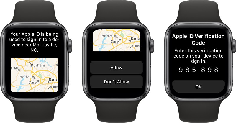 Apple Watch ที่มี watchOS 6 หรือใหม่กว่า สามารถรับรหัสยืนยันเมื่อคุณลงชื่อเข้าใช้ด้วย Apple ID ของคุณได้ แต่ไม่สามารถทำหน้าที่เป็นอุปกรณ์ที่เชื่อถือได้สำหรับการรีเซ็ตรหัสผ่าน