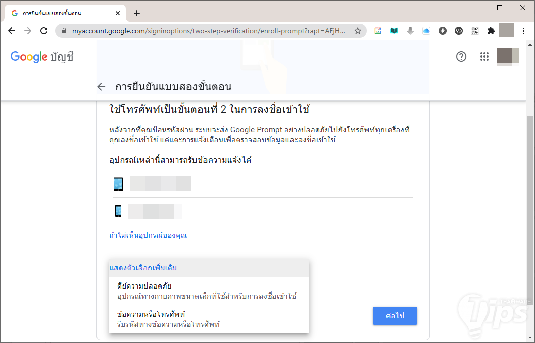 เลือกวิธีรับรหัส 2FA ที่ต้องการ แล้วทำตามขั้นตอนที่มันแนะนำ เอารหัสที่ได้จากแอป Authentication หรือ SMS มาใส่เป็นอันเสร็จสิ้น
