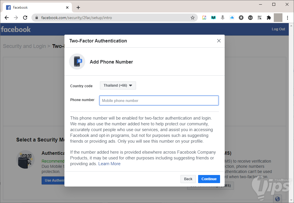 ใส่เบอร์โทรศัพท์ที่เราต้องการใช้ในการยืนยันลงไป แล้วคลิก Continue