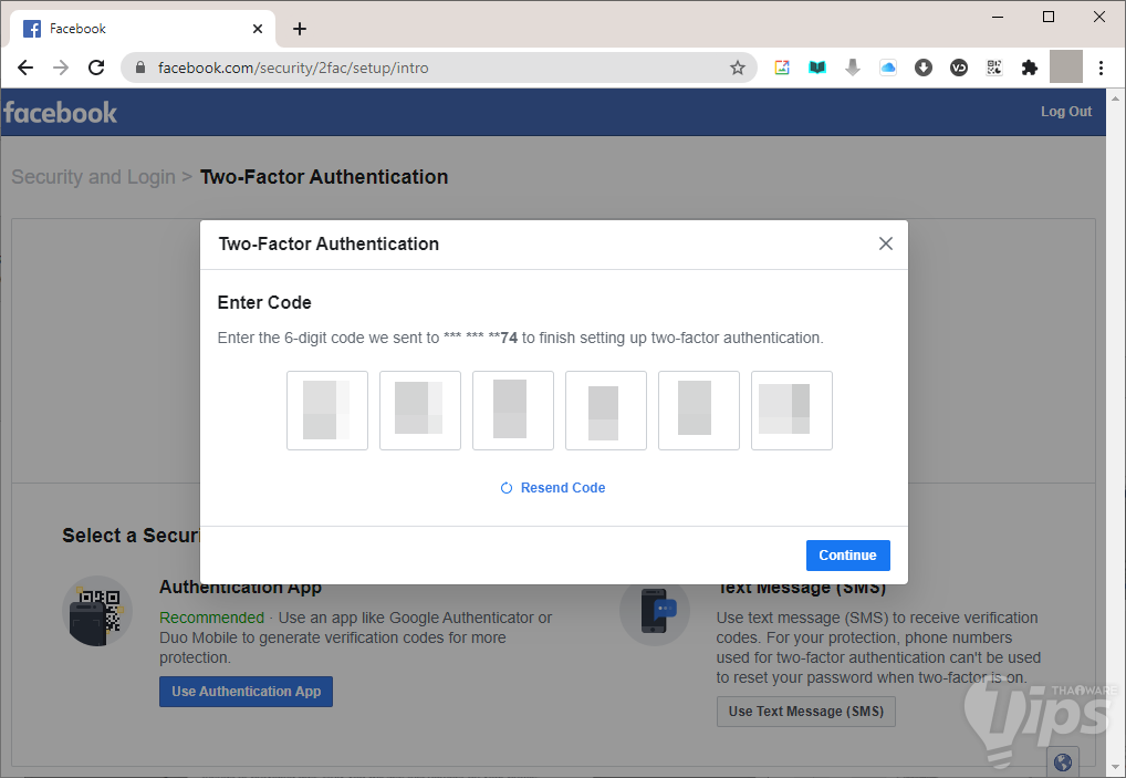 ใส่รหัสผ่านที่ทาง Facebook ส่งมาให้เราทางสมาร์ทโฟน แล้วคลิก Continue แล้วก็ Done เป็นอันเรียบร้อย