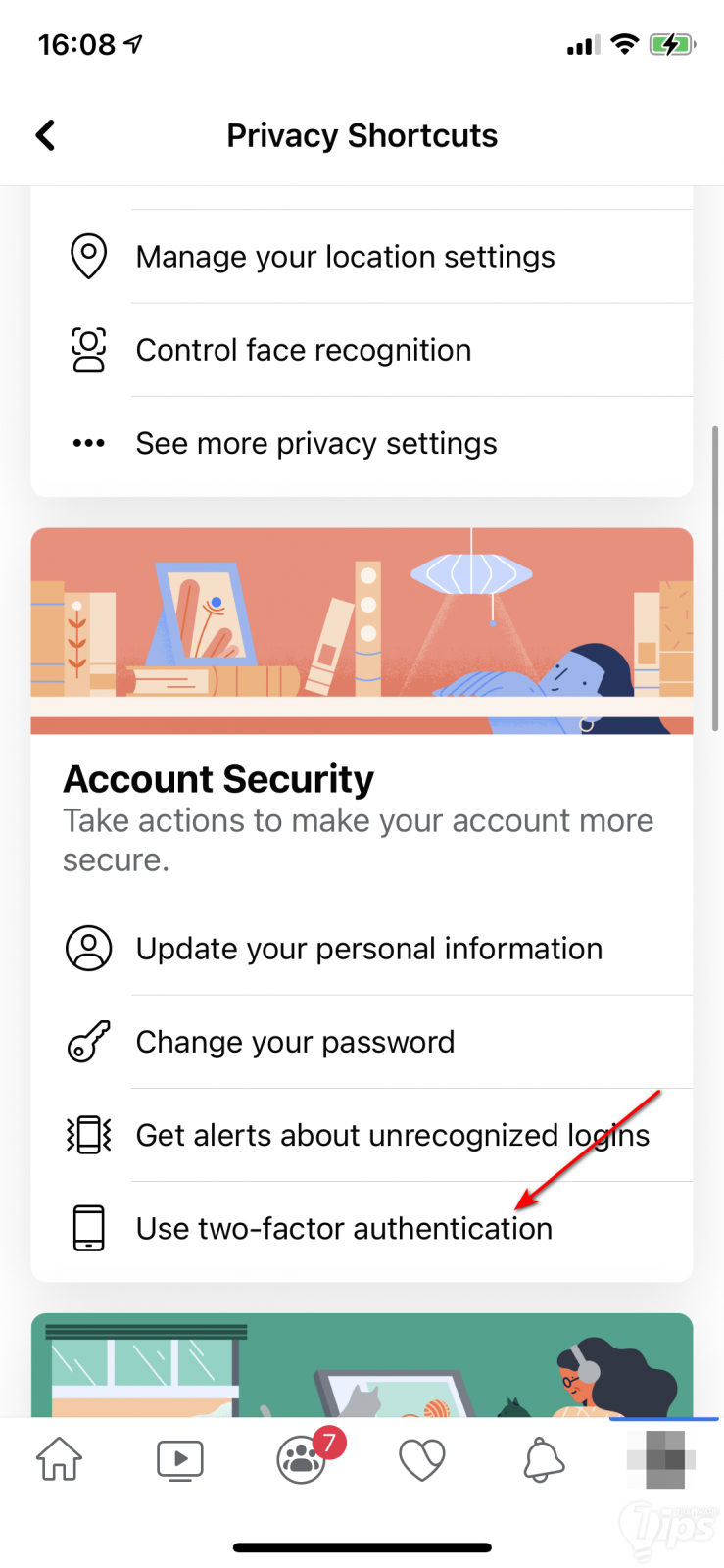 อันที่จริงขั้นตอนก็ไม่ต่างจากการทำบนคอมพิวเตอร์สักเท่าไหร่ แตะไปที่ Settings & Privacy → Privacy Shortcuts แล้วแตะเลือก Use two-factor authentication