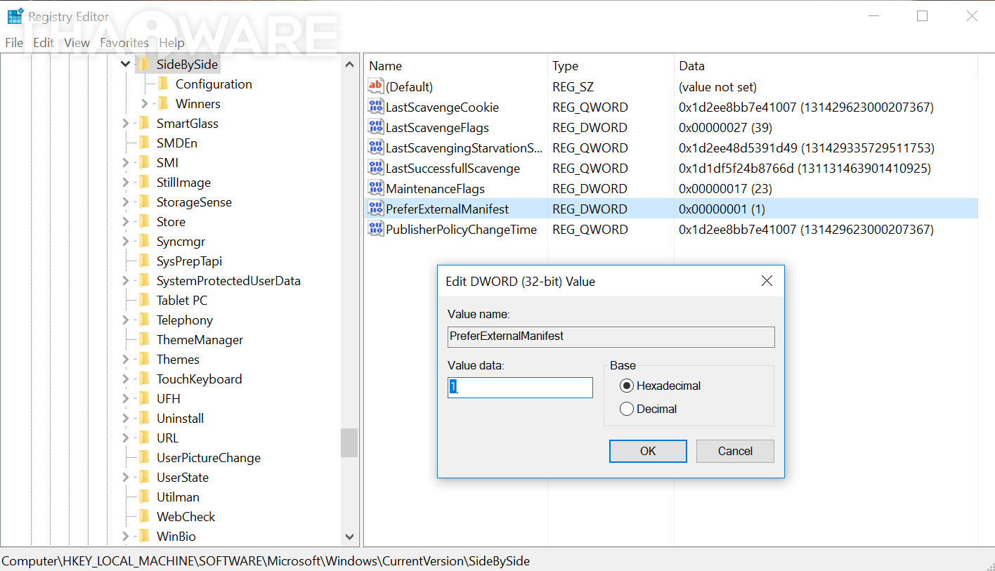 • คลิกขวาที่ PreferExternalManifest เลือก Modify ตั้ง Value เป็น 1 และ Decimal แล้วคลิก OK