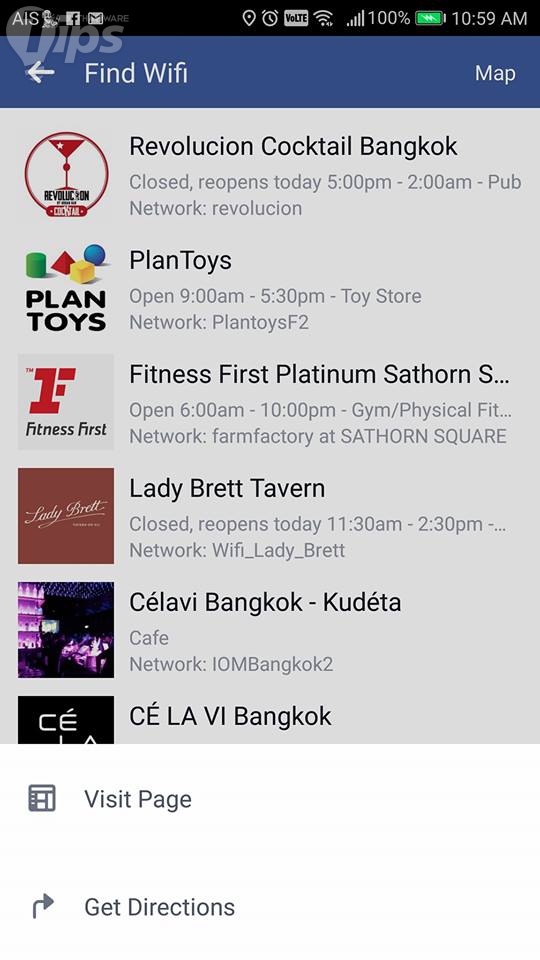 เมื่อเปิดเข้ามา Find Wi-Fi จะลิสต์รายการ Wi-Fi จากสถานที่ต่างๆ ซึ่งส่วนใหญ่เป็นร้านค้า และร้านอาหาร ข้อมูลคร่าวๆ ของร้าน อย่างเช่น เวลาเปิด-ปิด (ที่ดึงมาจากรายละเอียดของเพจร้าน) และชื่อ Wi-Fi ให้เราได้ตั้งเป้าหมาย ว่าจะเดินไปปักหลักที่ร้านไหนดี ซึ่งนอกจากจะดูเป็นรายการได้แล้ว เรายังสามารถดูตำแหน่งของร้านต่างๆ ในรูปแบบแผนที่ได้ด้วย