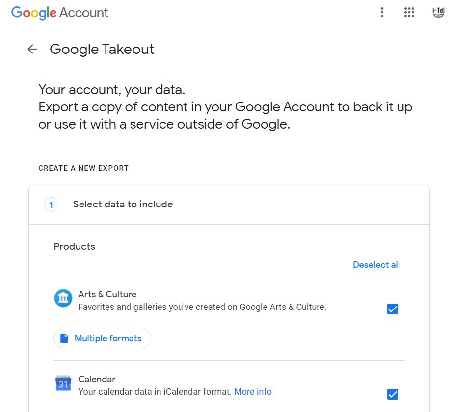จากนั้นเราจะเข้าสู่ Google Takeout ตรงนี้แหล่ะ คือ ช่องทางให้เราจวกทุกอย่างบน Google Account ออกมาเก็บไว้เป็นไฟล์สำรองได้ ซึ่งรวมถึงข้อมูลจาก YouTube ด้วยนั่นเอง โดยสังเกตก่อนว่าบัญชีที่กำลังจะสำรองนั้น เป็นบัญชีที่ถูกต้องหรือไม่ โดยให้ดูที่โปรไฟล์ด้านขวาบน ถ้าใช่ก็ไปกันต่อ