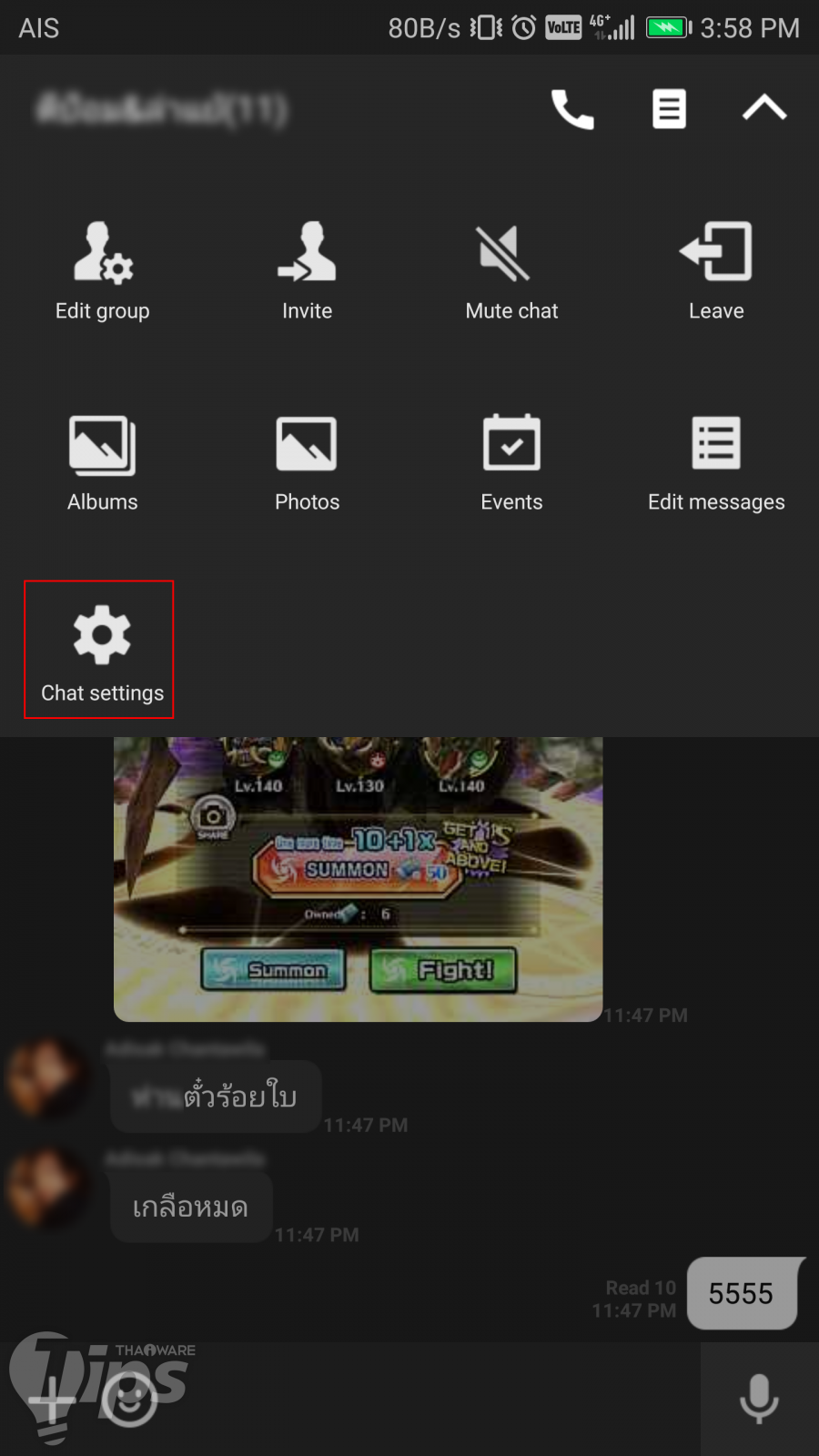 ขั้นตอนแรกเลย ก็ไปที่หน้าต่างแชทไลน์ที่เราต้องการจะเปลี่ยนพื้นหลัง จากนั้นเปิดเมนูที่ปุ่มลูกศร (V) ด้านขวาบน จากนั้นเลือก Chat Setting
