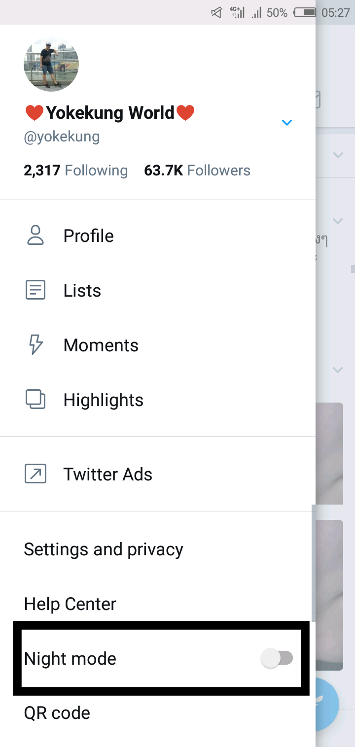 ใครที่ใช้ Twitter บนสมาร์ทโฟน ใช้แอปฯ Twitter ตัว Offcial (ไม่ใช่ 3rd party) กดที่รูปโปรไฟล์ เข้า Night Mode