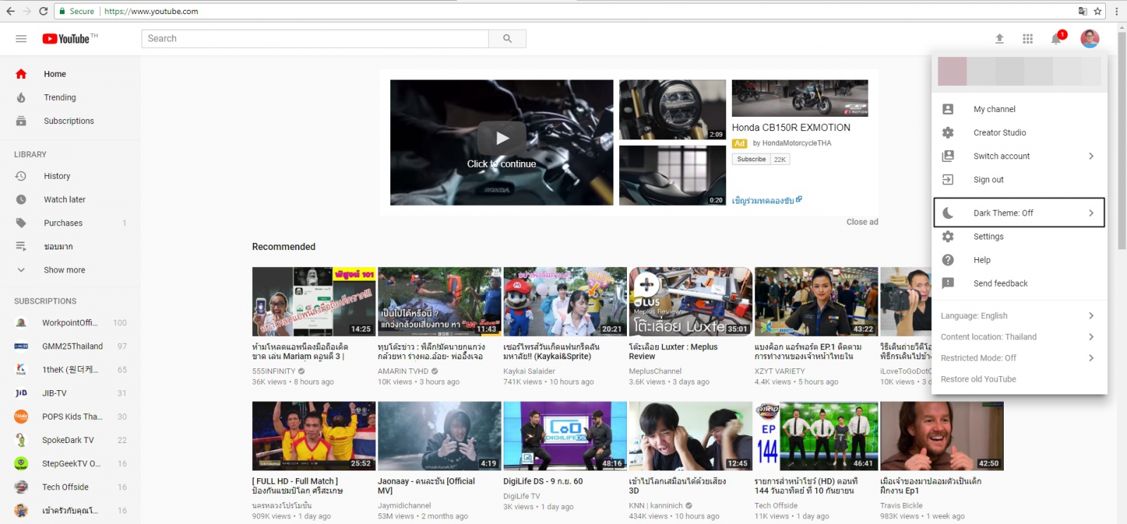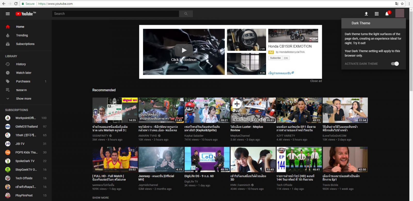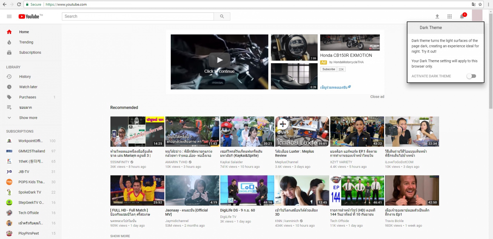 YouTube Dark Theme ใน Google Chrome Browser บน PC