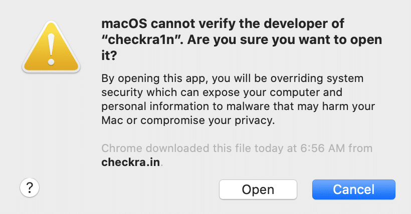 คลิกขวาที่แอป checkra1n ในโฟลเดอร์ Applications แล้วเลือก Open อย่าเปิดแอปฯ ด้วยการดับเบิ้ลคลิก จากนั้นให้คลิก Open อีกครั้ง เมื่อมีหน้าต่างแจ้งเตือนเรื่องความปลอดภัยเด้งขึ้นมา