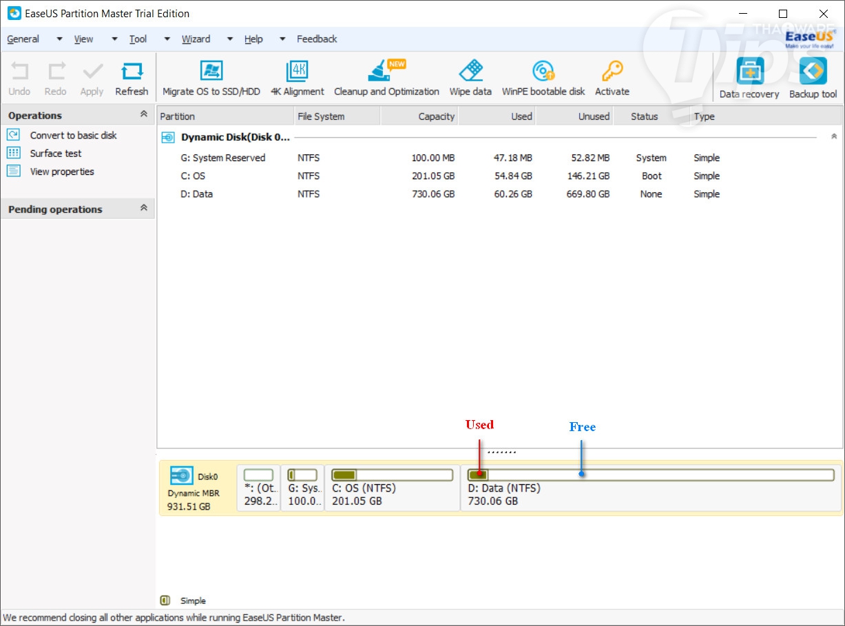 2. เมื่อเปิดโปรแกรมมา ก็จะเห็นหน้าจอหลักเหมือนรูปด้านบน ให้เราตรวจสอบก่อนว่า Drive C กับ Drive D อยู่ใน HDD ตัวเดียวกันหรือเปล่า และต้องดูด้วยว่า Drive D นั้น มีเนื้อที่ว่างเหลืออยู่เท่าไร พอที่จะย้ายไปให้ Drive C หรือไม่
