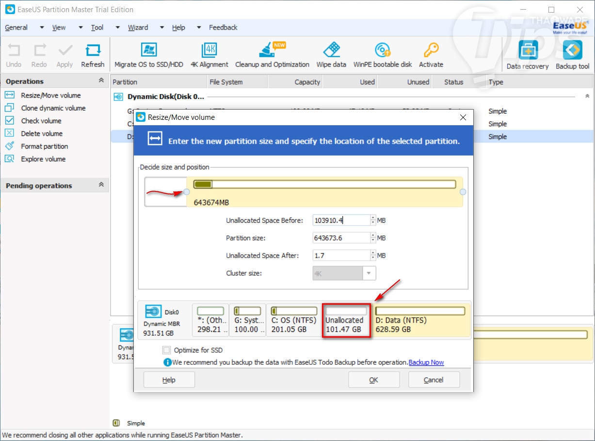การที่เราจะเพิ่มเนื้อที่ให้กับ Drive C ให้เป็น 300GB ได้นั้น ต้องตัดพื้นที่ใน Drive D 100GB มาต่อให้ ดังที่เห็นในรูปด้านบน ซึ่งก็มีข้อแม้ที่ว่า การย้ายนั้น "ต้องทำใน HDD ลูกเดียวกันเท่านั้น" หากเรามี 2 ลูกเราจะไม่สามารถนำจากลูกที่ 2 มาเพิ่มให้ลูกที่ 1 ได้
