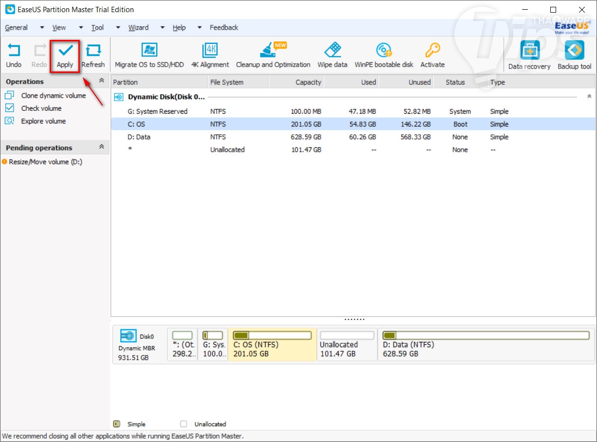 6. เมื่อกลับมาถึงหน้าจอหลักให้เรากดปุ่ม "Apply" หลังจากนั้น ก็รอให้ตัวโปรแกรมจะทำการปรับขนาดของ Drive D