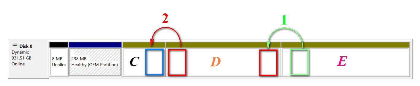 สีเขียว คือขั้นตอนที่ 1 ย้ายจาก Drive E > Drive D , สีแดง คือขั้นตอนที่ 2 ย้ายจาก Drive D > Drive C