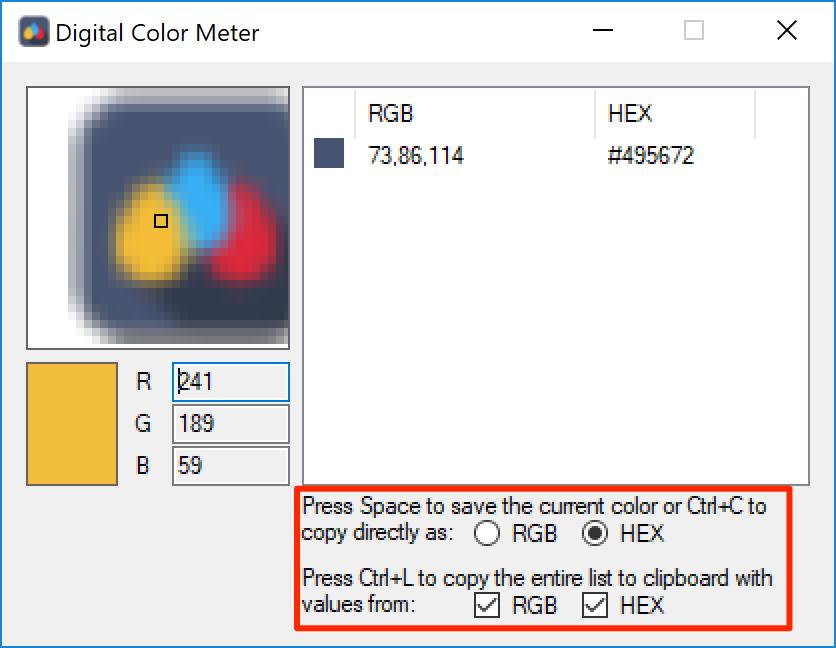 เราสามารถเลือกได้ว่าจะคัดลอกสีที่เราเลือกจากโปรแกรมในรูปแบบ RGB หรือ HEX ก็เลือกตามช่องได้เลย