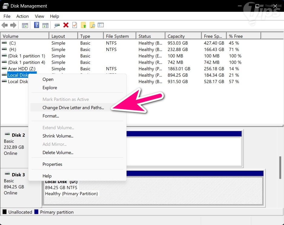 เอาไว้ใช้เวลาที่เราต้องการเปลี่ยน Drive Letter เช่น จาก ไดร์ฟ D: ไปเป็น ไดร์ฟ E: หรืออาจจะใช้ในกรณีที่เราติดตั้งไดร์ฟใหม่เพิ่มเข้าไปในระบบ แล้วระบบปฏิบัติการ Windows มองไม่เห็น ก็อาจเป็นเพราะตัวไดร์ฟยังไม่มี Drive Letter ของตัวเอง ก็ให้เราเข้ามาแก้ไข หรือเพิ่มได้ด้วยการคลิกขวาที่ไดร์ฟเป้าหมาย แล้วเลือก "เมนู Change Drive Letter and Paths..."