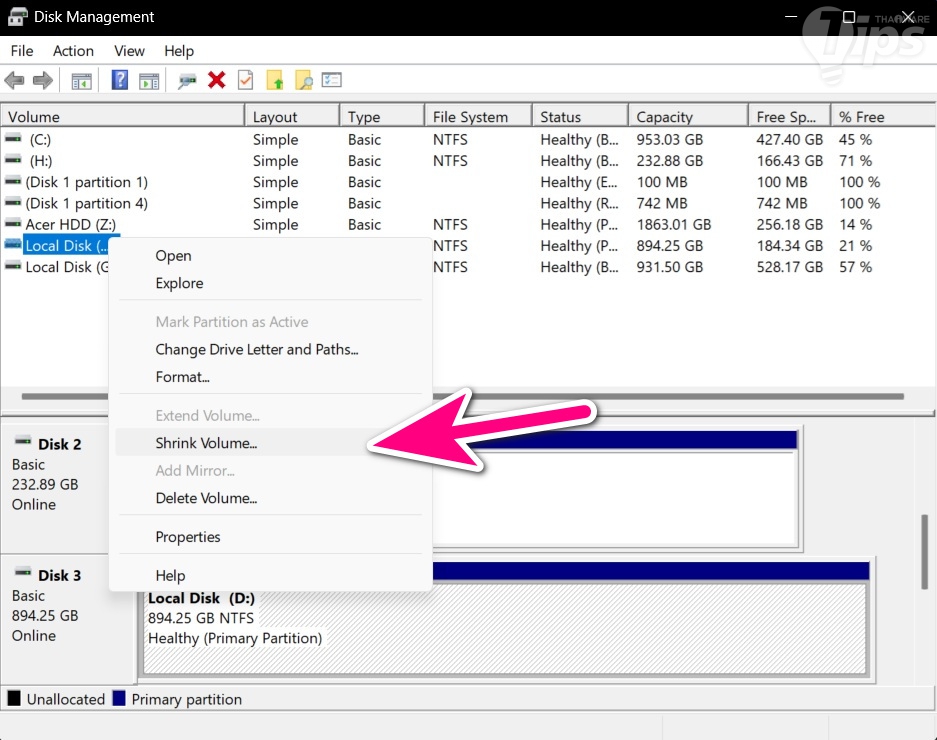 ในกรณีที่เราต้องการแบ่งพาร์ทิชันใหม่ เราจะเริ่มต้นจากการลดขนาดของพาร์ทิชันเดิมเสียก่อน แล้วนำพื้นที่ว่างที่ถูกแบ่งออกมา มาสร้างเป็นพาร์ทิชันใหม่ ซึ่งสามารถทำได้ด้วยการคลิกขวาที่พาร์ทิชันเป้าหมาย แล้วเลือก "เมนู Shrink Volume..."