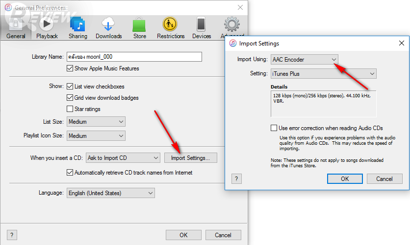 สำหรับคนที่ไม่มี Create AAC Version อาจจะขึ้นเป็น AIFF, MP3 หรือ WAV ให้เราเข้าไปปรับรูปแบบการแปลงไฟล์ของ iTunes ก่อนได้ด้วยการไปที่เมนู Edit → Preferences... ที่แท็บ General คลิกที่ Import Settings ตรง Import Using เลือกเป็น AAC Encoder ครับ