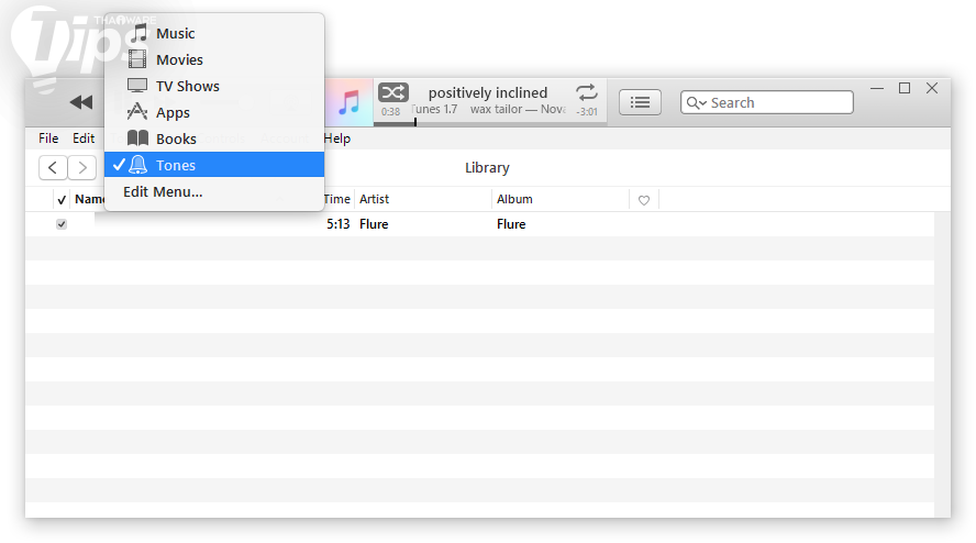 ก่อนอื่น เปิด โปรแกรม iTunes ขึ้นมาก่อน แล้วดูว่าด้านซ้ายบนมี "เมนู Tones" แล้วหรือยัง ถ้ายังไม่มีให้เข้าไปเปิดก่อนครับ