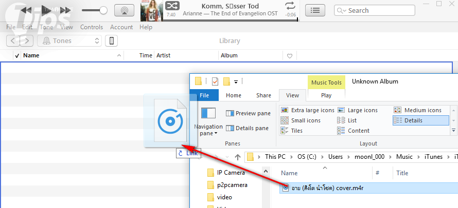 ทำการลากคลิกค้างที่ไฟล์ริงโทน เลากไฟล์มาใส่ใน โปรแกรม iTunes โดยให้เรานำไฟล์มาวางไว้ตรง "On My Device" เท่านี้ก็เรียบร้อย