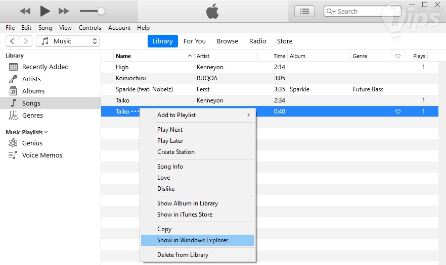 ที่แท็บ Library จะปรากฏเพลงที่เราเพิ่งเพิ่มเข้าไปเมื่อสักครู่ ให้เรา "คลิกขวา" ที่เพลงที่เราต้องการทำเป็นเสียงเรียกเข้า แล้วเลือก "เมนู Song Info"